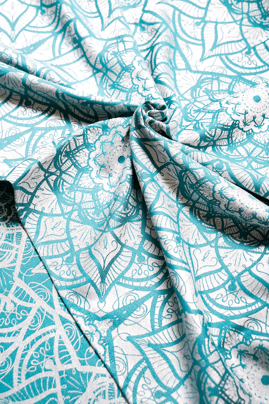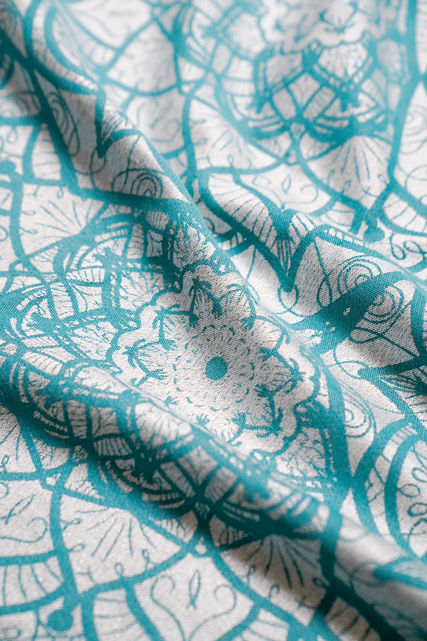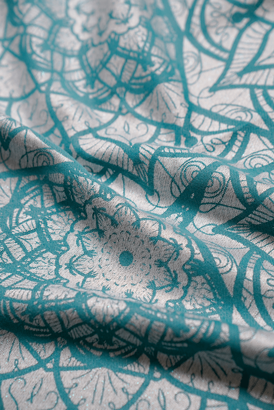 Lilenia Jonathan bringt das Gefühl eines leichten Sommertages auf Stoff: Türkisfarbenes Licht, zarte Mandala-Blüten, ein sanfter Glanz.