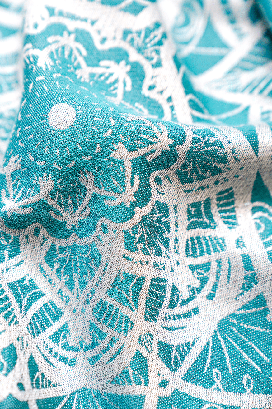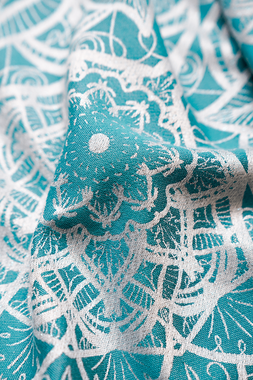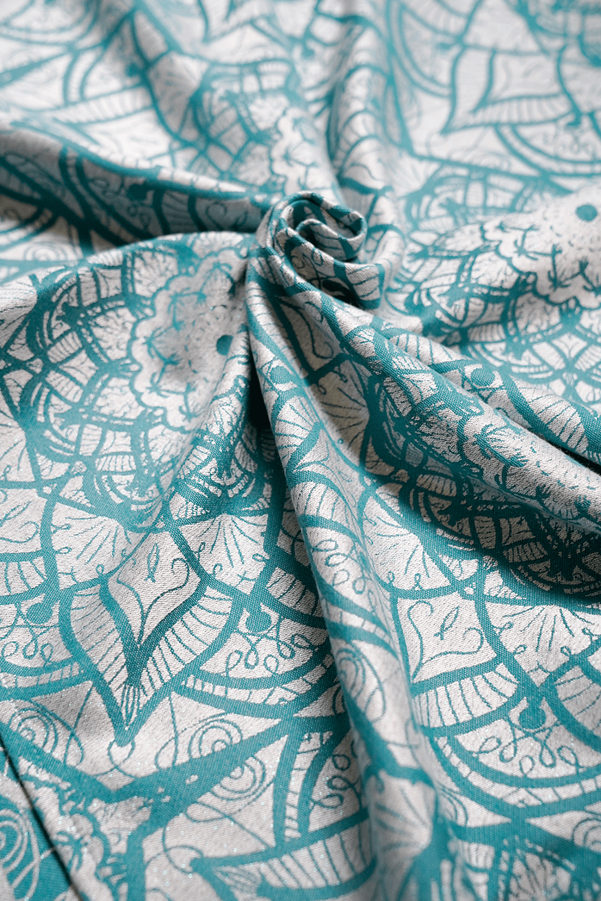 Lilenia Jonathan bringt das Gefühl eines leichten Sommertages auf Stoff: Türkisfarbenes Licht, zarte Mandala-Blüten, ein sanfter Glanz.